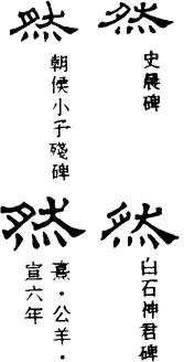 然字从火从肰,肰字又由犬、肉会意,指狗肉,故然字的本义是指用火烧烤狗肉,泛指燃烧,当即“燃”的本字。然在后世典籍和口语中,多用作连词、副词以及副词或形容词的后缀,又表示如此、是、对、不过、但是等义。