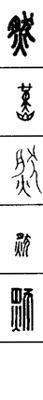 从上到下依次是小篆、甲骨文、金文、古玺及战国文字、缪篆及汉代文字、鸟虫篆。
