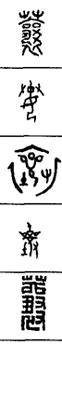 从上到下依次是小篆、甲骨文、金文、古玺及战国文字、缪篆及汉代文字、鸟虫篆。