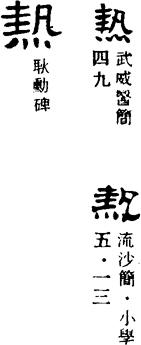 S.189《老子道德經》:“躁勝寒,靜勝熱,清靜爲天下正。”S.76《食療本草》:“案經:壓丹石,去頭面熱風。”S.610《啟顏錄》:“時初夏微熱。”S.202《傷寒論·辨脉》:“諸浮數脉當發熱而洗淅惡寒。”