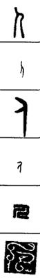 从上到下依次是小篆、甲骨文、金文、古玺及战国文字、缪篆及汉代文字、鸟虫篆。