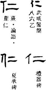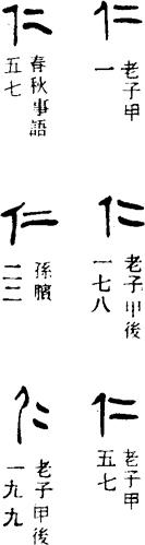 仁音rén。仁和人上古同属日纽真部,同音通假。仁的本义是对人亲善,仁爱。《说文》:“仁,亲也。”通人。朱骏声《说文通训定声》:“仁,假借为人。”《论语·里仁》:“观过,斯知仁矣。”(仔细考察他所犯的过错,这就可以知道他是什么样的人了。)《论语·雍也》:“仁者,虽告之曰:‘井有仁焉。’其从之也?”(有仁德的人,就是告诉他说:“井里掉下一个人了!”他是不是会跟着下去呢?)《管子·立政》:“大德不至仁,不可以授国柄。”(即使有最高道德,但不达到百姓身上,不能把国家政权交给他。国柄,也作国秉,国家政权。)《敦煌变文·维摩诘经讲经文》:“居士维摩众中尊,十德圆明仁所重。”(居士维摩是众人中最尊贵的,君子的十种美德完美明显被人敬重。居士,在家修道的人。十德,古称玉有十种特质,此喻君子十种美德,仁、智、义、礼、乐、忠、信、天、地、德。)