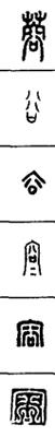 从上到下依次是小篆、甲骨文、金文、古玺及战国文字、缪篆及汉代文字、鸟虫篆。