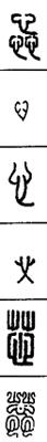 从上到下依次是小篆、甲骨文、金文、古玺及战国文字、缪篆及汉代文字、鸟虫篆。