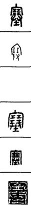 从上到下依次是小篆、甲骨文、金文、古玺及战国文字、缪篆及汉代文字、鸟虫篆。