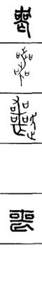 从上到下依次是小篆、甲骨文、金文、古玺及战国文字、缪篆及汉代文字、鸟虫篆。