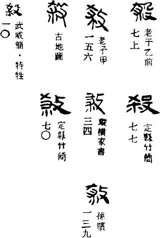 殺:上俗,中通,下正。”顏之推《顏氏見訓·風操》:“偏傍之書,死有歸殺。子孫逃竄,莫肯在家。”盧文弨補注:“俗本‘殺’作‘煞’,道家多用之。此從宋本。死有殺日,今杭人讀爲‘所介切’。”郝懿行曰:“‘殺’讀去聲,俗字作‘煞’。”“煞”字本從“殺”字形近訛變而來,而其古今演變之軌迹昭然若揭,不容置疑。試比較本條目所收以下諸字形便知: