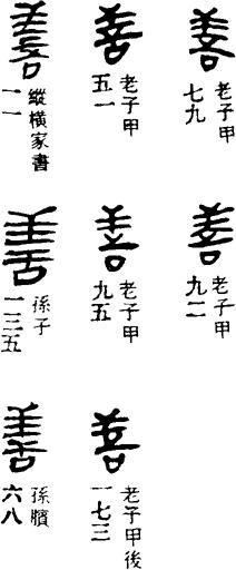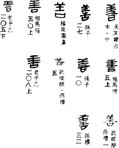 ①吉祥,好,正确。《战国策·秦策三》:“岂非道之符而圣人所谓吉祥善事与?”《孟子·离娄下》:“禹恶旨酒而好善言。”诸葛亮《出师表》:“以咨诹善道,察纳雅言。”也指好的人或事物。《国语·周语下》:“谚曰:‘从善如登,从恶如崩。’”《礼记·大学》:“小人闲居为不善,无所不至。”②擅长,善于。《论语·子罕》:“夫子循循然善诱人。”古诗《陌上桑》:“罗敷善蚕桑。”③妥善对待、处置。《孟子·尽心上》:“穷则独善其身,达则兼善天下。”《荀子·强国》:“善日者王,善时者霸。”今成语有“善始善终”。④友好,亲善。《国语·晋语三》:“夫固国者,在亲众而善邻。”《世说新语·简傲》:“嵇康与吕安善,每一相思,千里命驾。”⑤表示赞同、承诺之词。《左传·昭公十六年》:“宣公曰:‘善哉,子之言是。’”《战国策·齐策二》:“王曰:‘善。’乃止。”⑥多,容易。《诗经·鄘风·载驰》:“女子善怀,亦各有行。”《史记·河渠书》:“岸善崩。”今成语有“多愁善感”。
