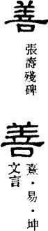 善为“膳”的本字。古人以羊为膳食的美味,故金文的善字从羊从二言,表示众口夸赞的意思。善字由膳食之美引申为美好之义,故后世另造“膳”字来表示它的本义。又羊性温和驯顺,故善又有善良、慈善之义,与“恶”相对。善字用作动词,则有喜好、爱惜、亲善、擅长等义。