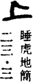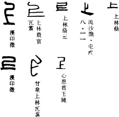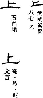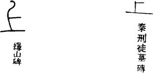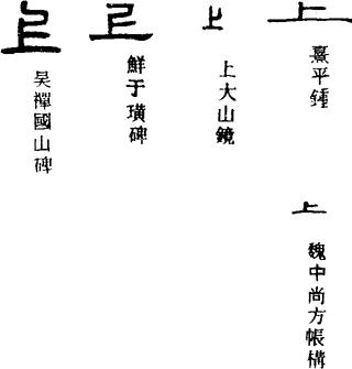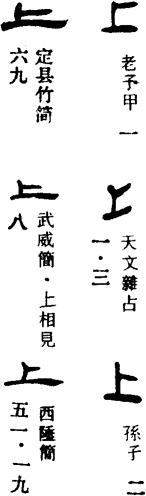 〈辨〉上字的甲金文形体作一长横上加一短横,指示在上。六国古文改一短横为一长竖,呈⊥形。篆书形讹,楷书作上。