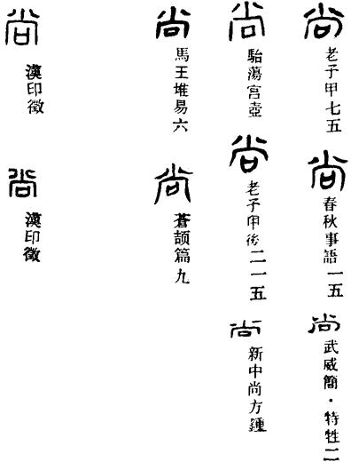 〈辨〉尚字金文、篆书从八向声,本义为赠,形符从八,表示分己物予人的意思;引申有崇尚义。