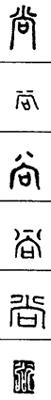 从上到下依次是小篆、甲骨文、金文、古玺及战国文字、缪篆及汉代文字、鸟虫篆。