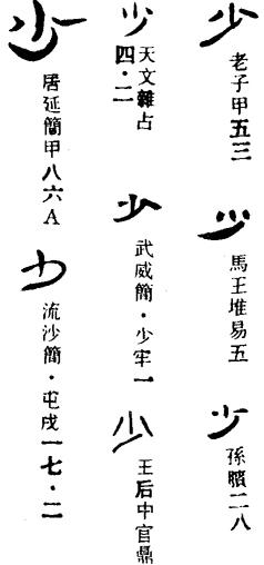 (難)……卑(譬)道之才(在)天下也,猷(猶)少浴(谷)之與江(海)。”馬王堆帛書《老子》甲、乙本,王弼本少作小,漏之字。上博楚竹書《容成氏》簡五二:“以少會者(諸)侯之帀(師)於