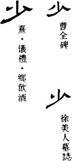 少音xiǎo。少,上古属书纽宵部;小,上古属心纽宵部。二字为迭韵通假。少的本义是数量小,与“多”相对。《说文》:“少,不多也。”通小。《左传·定公十四年》:“从我而朝少君,少君见我,我顾,乃杀之。”(跟从我去朝见夫人,夫人接见我,我向你递眼色,你就杀死她。少君,即小君,诸侯的夫人。《礼记·曲礼下》:“公侯有夫人,夫人自称于诸侯曰寡小君。”)《左传·哀公二十六年》:“乃盟于少寝之庭。”(就在小寝的院子里盟誓。杨伯峻注:“少寝即小寝,见《礼记·玉藻》,为诸侯退朝后燕息之处。”)左思《蜀都赋》:“亚以少城,接乎其西,市廛所会,万商之渊。”(其次以小城跟西区相接,市街会合的地方,就成为各种商货的集中地。亚,其次。市廛,市街。渊,渊海,这里指货物集中地。)