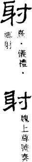 ㈠shè ①放箭,亦指用枪炮射击。晁错《言兵事疏》:“且驰且射。”②古官名。商代设置,掌射。③射出;用压力或弹力送出。如:发射;喷射。④有所指。如:影射。⑤逐取;追求。如:射利。⑥猜度。《汉书·东方朔传》:“上尝使诸数家射覆。”