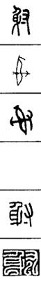 从上到下依次是小篆、甲骨文、金文、古玺及战国文字、缪篆及汉代文字、鸟虫篆。