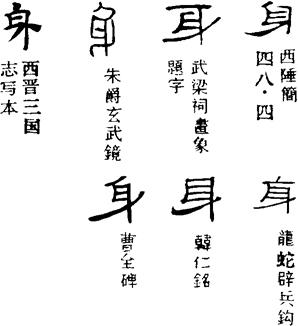 〈辨〉身字甲骨文象人而隆其腹,表示有了身孕;金文字形讹变,且下加一横为指示符号,指颈以下、股以上的躯干部;篆书讹变,楷书作身。身字用为偏旁,表示和身体有关的意义;偶尔也作声符。