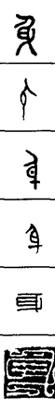从上到下依次是小篆、甲骨文、金文、古玺及战国文字、缪篆及汉代文字、鸟虫篆。