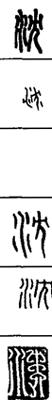 从上到下依次是小篆、甲骨文、金文、古玺及战国文字、缪篆及汉代文字、鸟虫篆。