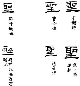 甲骨文、金文的圣字,象一个人站着听人说话的样子。其中的口表示有人在说话,而人形头上的耳朵特别突出,则表示听力极佳的意思。所以,圣字的本义指听觉灵敏,又有聪明睿智、百事通达之意。古代称人格品德崇高、学识才能有极高成就的人为“圣”,如圣贤、诗圣、书圣等。在君主时代,圣字则多用为对帝王的尊称,如圣上、圣旨、圣恩等。