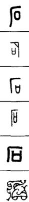 从上到下依次是小篆、甲骨文、金文、古玺及战国文字、缪篆及汉代文字、鸟虫篆。