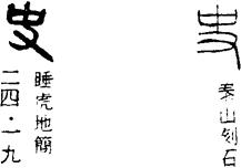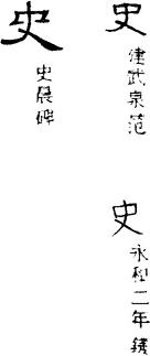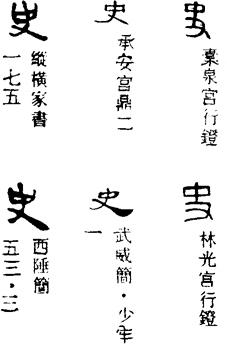 〈辨〉史字甲骨文象手持一种狩猎工具之形,其工具大约是在棍棒上绑上石片类重物。在原始社会,狩猎曾经是生活资料的主要来源,所以制史字表示狩猎活动的领导者,后来泛指官员。史字和吏、事、使三字甲骨文字形略有不同,但示意方式是一致的,详吏字下。金文、篆书形体也无大变,楷书作史。