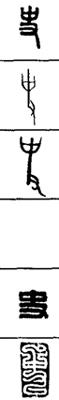 从上到下依次是小篆、甲骨文、金文、古玺及战国文字、缪篆及汉代文字、鸟虫篆。