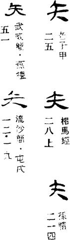 〈辨〉矢字甲骨文为象形字,正象箭形;金文、篆书形体讹变,楷书作矢。矢字用为偏旁,一般表示同箭有关的意思,偶尔也作声符。