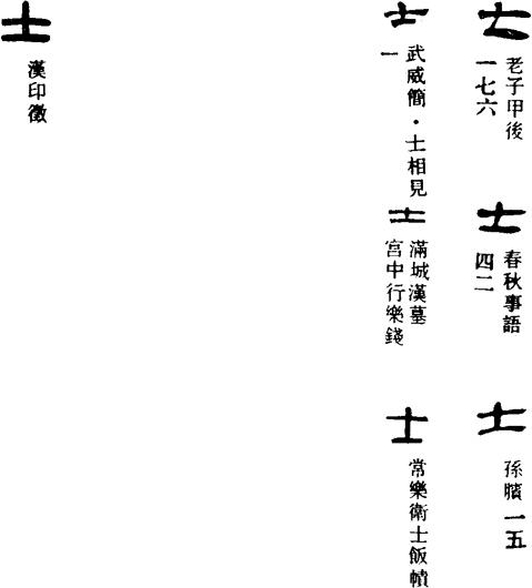 早期金文中的士字,和“王”一样,是斧钺的象形。不过,“王”是一种具有权力象征意义的执法刑具——黄金大钺,而“士”则是指一般的斧状兵器或刑具。士字的本义指手执兵器(或刑具)的武士或刑官,如士卒(指战士)、士师(指狱官)等;引申为成年的男子,如士女(指成年的男女)。士还代表一种社会阶层,其地位在庶民之上,如士族(指在政治上、经济上享有特权的世家大族)、士子(多指士大夫,即做官的人,也是旧时读书应考的学子的通称)等。