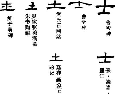 〈辨〉士字甲骨文中用为偏旁写作上,象雄性动物的生殖器,详见牡字下。引以称未婚男子,泛指男人。金文讹变;篆书讹作从十从一;楷书作士。注意,篆书楷书中土与士仅以两横的相对长短为区别。