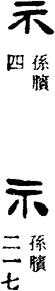 〈辨〉示字甲骨文象初民祭石的形状,其基本形体为一长竖上加一短横,据说是男性生殖器的象形。生殖器崇拜是原始社会普遍的信仰,母系氏族社会崇拜女性生殖器,父系氏族社会崇拜男性生殖器,人们按照生殖器官的特征确定或制做祭石,以它为生殖神的代表,按時祭祀以祈求生育、丰收等各种福佑,这就是最早的神。在初民看来,它能给人祸福,所以引申有神示,显示义。甲骨文有时在其上部或左右加点,表示祭品的碎屑。篆书讹变,楷书作示。示字用作偏旁,表示神主或和神鬼、祸福及祭祀有关的意义;偶尔也作声符;楷书中在左讹变作礻,俗称示字旁。