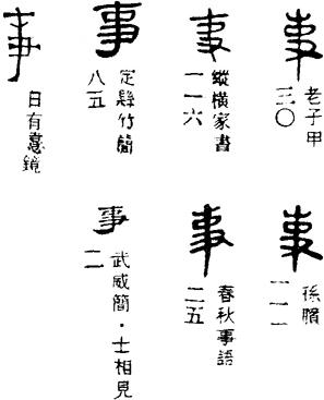 〈辨〉事字和吏、使等古文字中同字,详吏字下。篆书讹变,楷书作事。