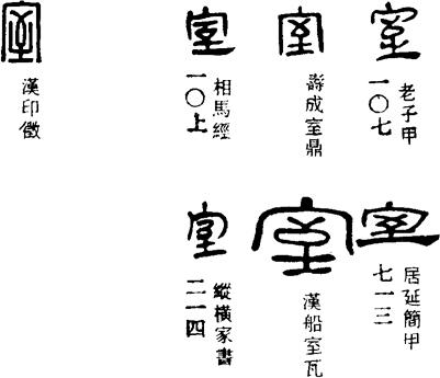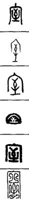 从上到下依次是小篆、甲骨文、金文、古玺及战国文字、缪篆及汉代文字、鸟虫篆。