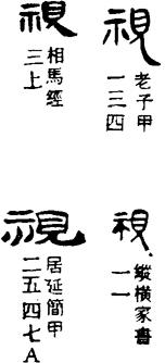 睡虎地秦簡《語書》:“爭書,因恙(佯)瞋目扼捾(腕)以視力,訏詢疾言以視治,誈醜言麃斫以視險,阬閬强肮(伉)以視强,而上猶智之殹(也)。故如此者不可不為罰。”視讀為示,顯示。又馬王堆帛書《老子》乙本卷前古佚書《經法·論》:“實者視〔人〕虚,不足者視人有餘。”又銀雀山竹簡《孫子兵法·計》:“……用而視之不用,近而視之遠,〔遠〕而視之近。利而誘之,亂而取之……”三個視字十一家本皆作示。又馬王堆帛書《老子》甲本《道經》:“友(柔)弱勝强,魚不〔可〕脱於潚(淵),邦利器不可以視人。”乙本作:“國利器不可以示人。”通行本視亦作示。又郭店楚簡《語叢三》簡一三~一四:“自視其所能,員(損)。自視其所不族,益。”《詩·小雅·鹿鳴》:“視民不恌。”鄭玄箋:“視古示字也。”《左傳·昭公十年》正義引視作示。又《左傳·宣公二年》:“以視於朝。”《史記·晉世家》引視作示。