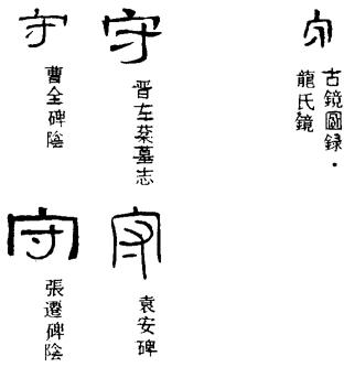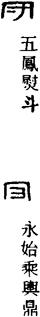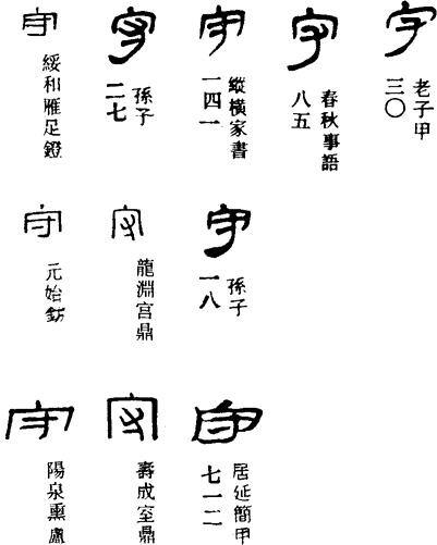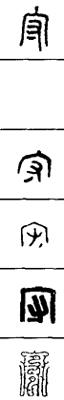 从上到下依次是小篆、甲骨文、金文、古玺及战国文字、缪篆及汉代文字、鸟虫篆。