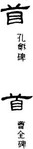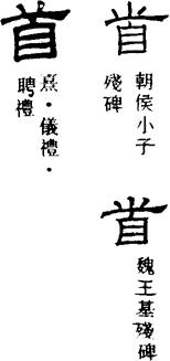 甲骨文首字是一颗头颅的形象,但这个头形并不大象人类的头,而是更象兽类(如猿猴)的头。金文的首字则只用一只眼睛和头发来作为头部的象征性符号。因此,首的本义是指人或其它动物的头。由头的意义引申,首字有首领之义,即指一群之长,又引申为事物的开始、第一、最高等义,如首届、首席、首当其冲、首屈一指等。