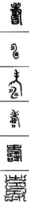 从上到下依次是小篆、甲骨文、金文、古玺及战国文字、缪篆及汉代文字、鸟虫篆。