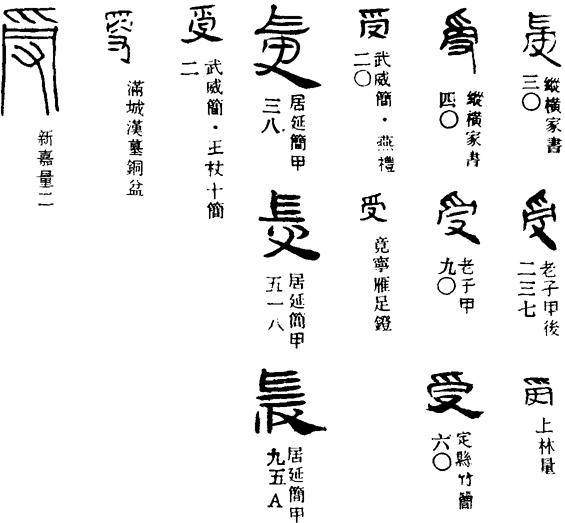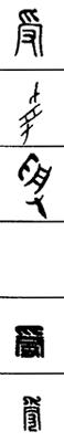 从上到下依次是小篆、甲骨文、金文、古玺及战国文字、缪篆及汉代文字、鸟虫篆。