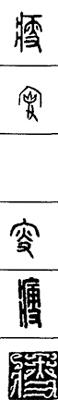 从上到下依次是小篆、甲骨文、金文、古玺及战国文字、缪篆及汉代文字、鸟虫篆。