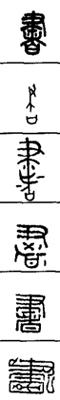 从上到下依次是小篆、甲骨文、金文、古玺及战国文字、缪篆及汉代文字、鸟虫篆。