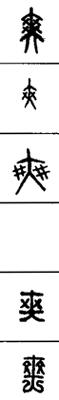 从上到下依次是小篆、甲骨文、金文、古玺及战国文字、缪篆及汉代文字、鸟虫篆。