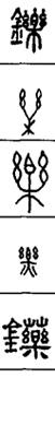 从上到下依次是小篆、甲骨文、金文、古玺及战国文字、缪篆及汉代文字、鸟虫篆。