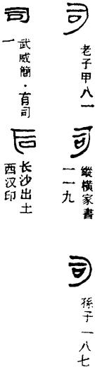 〈辨〉甲骨文中,司、后同形,从口从人,表示发号施令之人;人形稍变,臂部上扬,也有指点的意思。篆书中才以后为后,反后为司。不过,卜辞中,后字多借用毓字表示,详后字下;司字多表示年,后来写作祀或祠,商代称年为祀。金文中,司字多借用为嗣;作为官治之名如“司徒”、“司寇”等的司写作