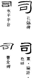 司音sì。司的本义是掌管、主管;主持。《说文》:“司,臣司事于外者。”《广雅·释诂三》:“司,主也。”司,又有窥察,探察;监视的意思。段注:“古别无‘伺’字,‘司’即‘伺’字。”《周礼·地官·媒氏》:“司男女无夫家者而会之。”(探察那些过了规定年令还没结婚的男女,让他们会合结婚。)《战国策·赵策三》:“良商不与人争买卖之贾,而谨司机。”(最好的商人不跟别人争议买卖的价格,却谨慎地窥察好时机。贾,同价。)《史记·陈涉世家》:“陈王以朱房为中正,胡武为司过,主司群臣。”(陈王将朱房任命为中正,胡武做司过,主管监督考察群臣。中正,主管人事、考核百官的官。司过,监察百官过失的官。按:中正、司过二职,均陈胜所设。)《汉书·灌夫传》:“(武帝)既罢起入,上食太后。太后亦已使人候司,具以语太后。”(武帝随即中止了廷辩,站起身走进宫室,去向太后进餐。太后也早已派人窥察了廷辩情况,窥察的人把全部情况告诉了太后。)“窥察,探察;监视”义,后来加义符“人”写作“伺”。